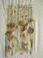 ...for now. Here are pix trying to show the sunflower piece for the September BJP finished. The colours are subtle golds, beiges, browns but after many attempts to get a good image, I resigned myself to the idea that the image will never show the richness of texture and colour that is the real embroidered & beaded piece. The pix have a blue cast that knocks back the yellow hue in real life. I think it needs more darks to represent shadows but it needs to rest for a while before I come back to that. It now lives in my BJP folder in a plastic pocket, waiting for me to come back to it at the end of the year (or perhaps sooner) for finishing.